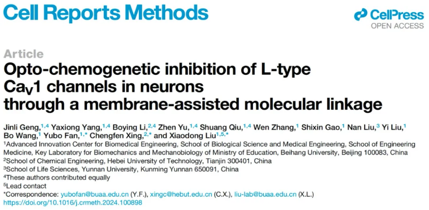 On November 18, 2024, the research article "Opto-chemogenetic inhibition of L-type CaV1 channels in neurons through a membrane-assisted molecular linkage" was published in Cell Reports Methods, a Cell Press journal. Led by Prof. Xiaodong Liu's lab, in collaboration with Prof. Yubo Fan from Beihang University, this study presents a n-ovel approach integrating near-infrared (NIR)-responsive nanoparticles, rapamycin-induced dimerization, and Ras/membrane-assisted molecular linkage to achieve efficient, specific inhibition of neuronal CaV1 channels. The study desig-ned and validated inhibitory peptides for both recombinant and endogenous CaV1 channels. Using NIR, the researche-rs achieved precise inhibition of Ca²⁺ flux-neuritogenesis coupling with high spatiotemporal resolution. This innovati-ve approach offers a powerful tool for investigating neuronal calcium signaling and related mechanisms.