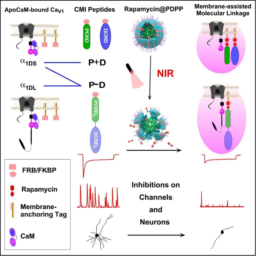 Building on previous studies (Yang et al., Communications Biology 2022), the team introduced a membrane-assisted molecular linkage for CMI peptides. NIR-triggered rapamycin release facilitated FRB/FKBP binding, driving inhibitory peptides from the cytoplasm to the membrane, resulting in rapid and specific inhibition of CaV1 activity. Utilizing GCaMP-X calcium sensors (Geng et al., eLife 2022), the researchers demonstrated the downregulation of Ca²⁺ oscillation-neuritogenesis coupling, confirming CaV1’s physiological role in neurons.